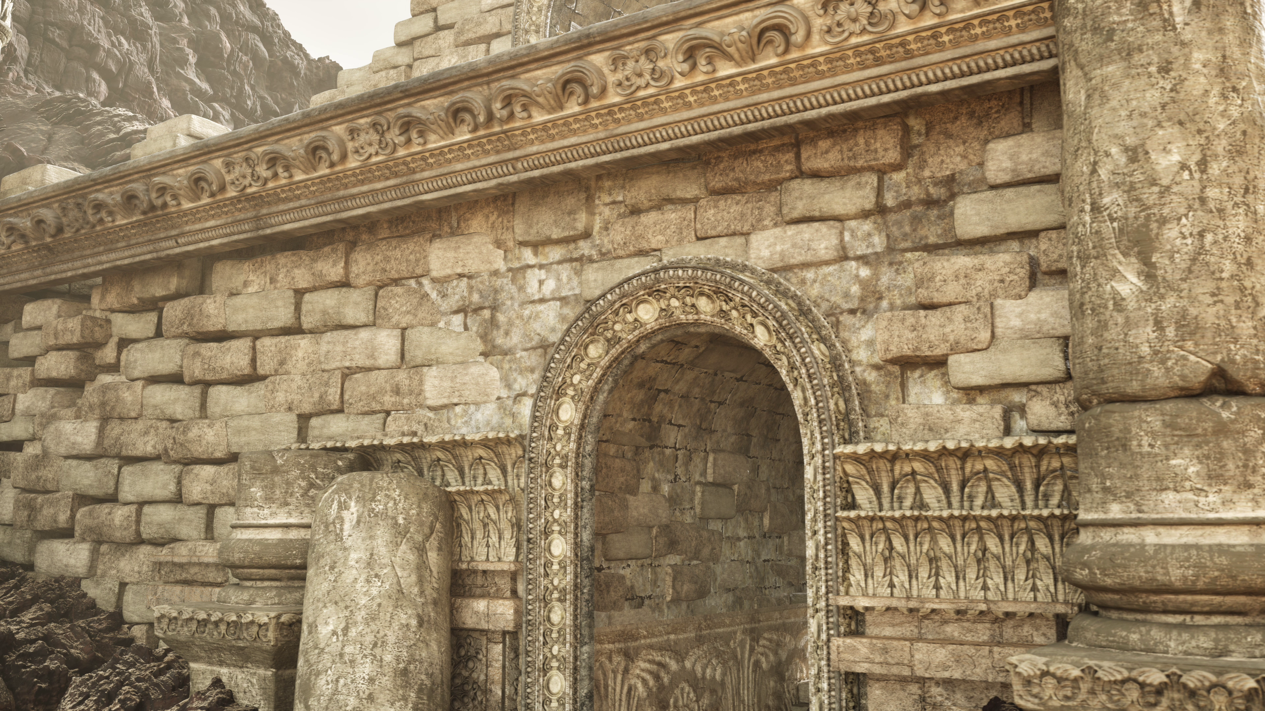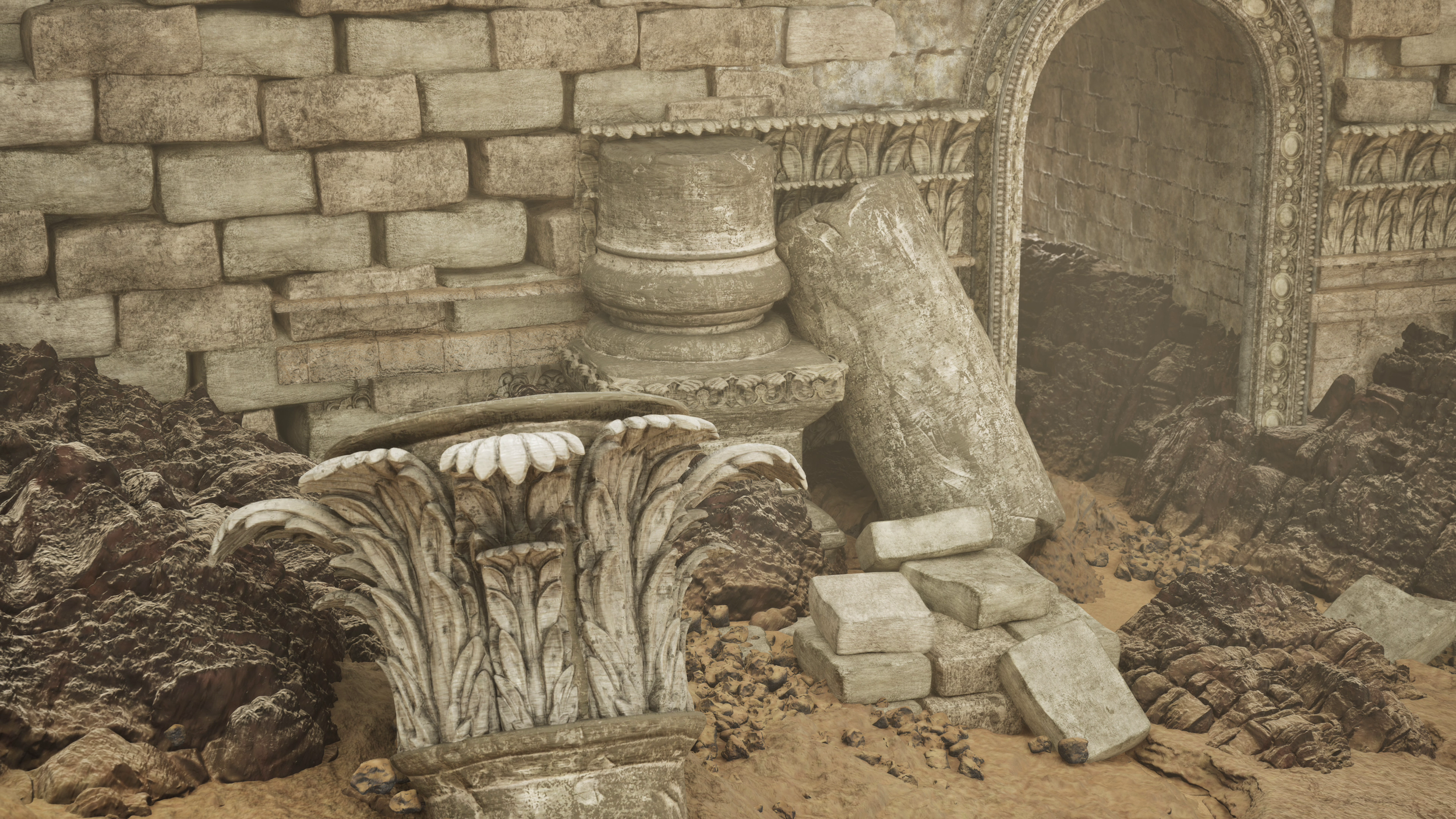 All assets are made from scratch, sculpted in Zbrush. Additionally, I made 4 tillable textures with Substance Designer. I created landscape material with layer blending and applied RVT (real-time virtual texture) to achieve a nice blend between rock assets and ground shader. I create a simple animated moving fog for that extra ambient mood. It is subtle, did not want it to overwhelm the structure. Utilizing world align to texture environment assets results in better quality in scaling without losing texture density.
